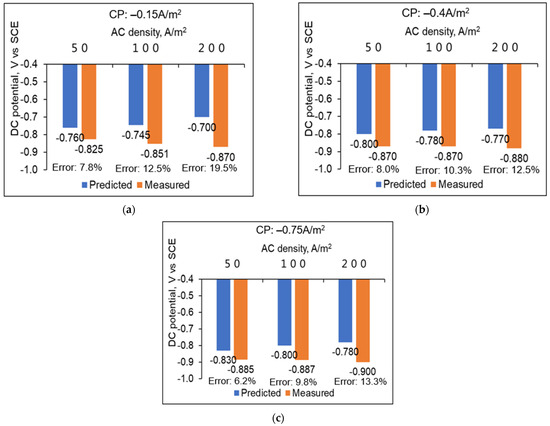 When applying a CP current density to achieve protection, comparisons between the predicted and measured DC potentials of C1018 pipe steel under AC interference are shown in Figure 7. This comparison revealed that the predicted values closely align with the measured potentials across various CP and AC densities, with errors less than 20%. Under the same AC density, both the predicted and measured DC potential shifted negatively as the CP current density became more negative. This means that, to mitigate AC corrosion, the CP current density can be increased to render the DC potential more negative. However, it should be cautiously calibrated to prevent over-polarization, and the specific environmental conditions and metal properties should be considered to balance corrosion protection with potential adverse effects. Under the same CP current density, the predicted DC potential shifted positively with the increase in AC density. However, contrary to expectations, the measured DC potential shifted negatively. This suggests that while an increase in AC density is theoretically expected to accelerate corrosion, an experimental protection effect was noted, contradicting with the engineering judgment that, with AC interference, the AC density will aggravate corrosion. This phenomenon was also observed in other studies [12,13], while the mechanism behind it is still inconclusive.