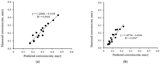 Correlation between predicted and measured corrosion rates: (a) C1018 and (b) X60.