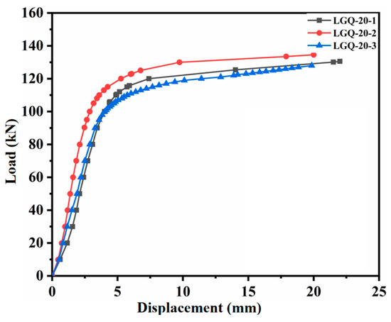 To investigate the force characteristics and damage patterns of the nodes under seismic action, the nodes are subjected to reciprocating low circumferential fatigue under displacement control. The loading amplitude is maintained at a constant value using a triangular wave curve with a constant loading rate. The loading regime is shown in Figure 3 below. Two sets of tests were performed for each loading amplitude, with Δy representing the displacement corresponding to the design value of the compressive load capacity. Based on previous static loading tests, the average axial compressive ultimate load of the specimen was 116.7 kN [22], and the static load–displacement curve is shown in Figure 4. According to the “Code for Quality Inspection and Assessment of Space Frame Structures” [24], the permissible test coefficient for the specimen’s load-carrying capacity is 1.6. Therefore, the design value of the specimen’s axial compressive static load-carrying capacity is 72.5 kN on average, with the corresponding displacement being 2.4 mm. In the following, Δy represents the displacement corresponding to the design value of the compressive load capacity. To investigate the seismic performance of the nodes, we selected multiples of 2.4 mm as the loading amplitude for the experiments, ranging from 4.8 mm to 8.4 mm. This approach enabled a systematic study of the mechanical properties of the nodes at various levels of deformation [25].