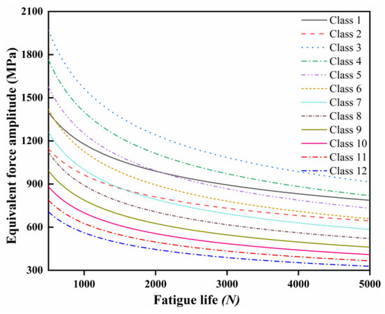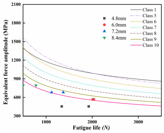 Substituting the equivalent force amplitude into the generalized equation allows it to be transformed, yielding the following equation . Therefore, the displacement amplitude from the test is substituted into Equation (9) to calculate the equivalent force amplitude. By comparing the equivalent force amplitude with the fatigue life and the S-N curves for Category 14, the results are obtained, as shown in Figure 13 below.