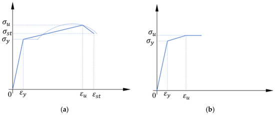 The material of the drum shell is Q345B, and the bolts are high-strength bolts of grade 10.9. The curved washers and curved Euro nuts are made of 45# steel. The steel stress–strain curve exhibits some nonlinearity. To simplify the calculation, its isomorphic relationship is generalized. Considering the Bauschinger effect that occurs under cyclic loading, a triple-fold model is used for the steel, as shown in Figure 15. As the bolt material properties test was not conducted, the determination of the principal structure was based directly on the relevant literature [29], as shown in Table 3 below.
