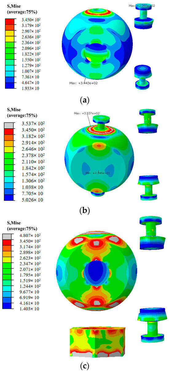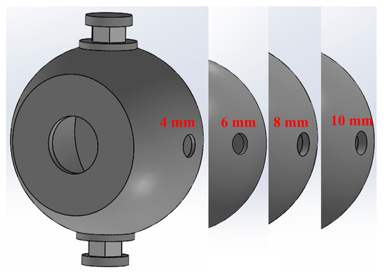 Wall thickness significantly influences the performance of the node. A parametric modeling analysis of the wall thickness of the bolted bulbous spherical shell is performed, with wall thicknesses selected as 4 mm, 6 mm, 8 mm, and 10 mm. The node schematic diagram is shown below in Figure 20.