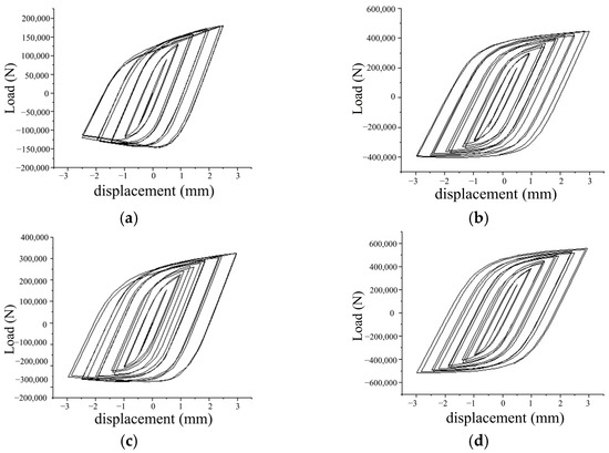 Hysteresis curves for different wall thickness nodes: (a) t = 4 mm; (b) t = 6 mm; (c) t = 8 mm; (d) t = 10 mm.