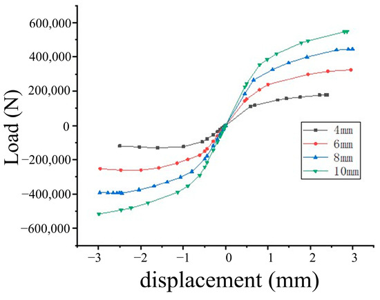 From the skeleton curves, it can be observed that the nodes go through elastic, elastoplastic, and plastic phases. When the displacement reaches the 0.5 mm level, the model is in the elastic stage, and the load–displacement relationship is linear. When the displacement cycle increases to 1.5 mm, the node pressure enters the yield stage. As the displacement increases to 2.5 mm, the node force begins to decrease, and most of the pressurized region enters the plastic region. By comparing the bearing capacity and yield point in the compression phase of the hysteresis process with the static loading curve, we found that their trends and numerical values are approximately consistent, indicating that the model can provide accurate numerical simulations.