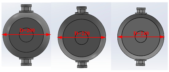 The ball diameter of the bolted drum ball node was varied to examine its effect on hysteresis performance. The wall thickness of the node is kept at 6 mm, and the thickness of the cover plate is kept at 8 mm. The outer diameter of the drum-shaped spherical shell is parametrically modeled with diameters of 200 mm, 220 mm, and 240 mm, as shown in Figure 25 below.