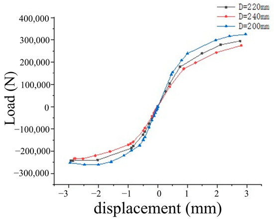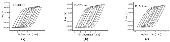 Hysteresis curve comparison: (a) D = 200 mm, (b) D = 220 mm, (c) D = 240 mm.