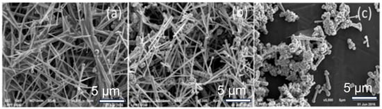 Synthesis of Cu NWs through the hydrazine method. The morphologies of Cu NWs synthesized with different hydrazine volumes: (a) 0.15 mL; (b) 0.25 mL; (c) 0.35 mL [59].