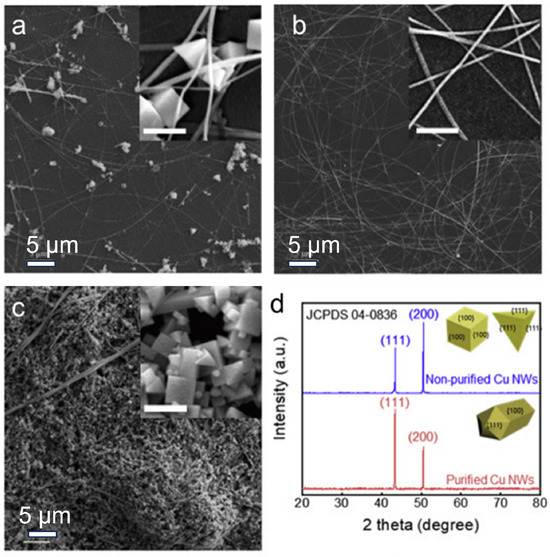Synthesis of Cu NWs through the hydrothermal method. (a) As-prepared Cu NWs; (b) Cu NWs after purification; (c) filtrate; (d) XRD of purified and non-purified Cu NWs [65].