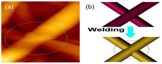 Joining of Cu NWs through the heating method. (a) Atomic force microscope (AFM) images of welded, stacked Cu NWs; (b) schematic illustration of the joining process between Cu NWs resulting from the heating method [66].