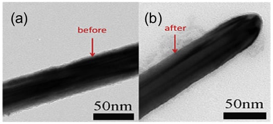 Acid treatment is an effective method for improving the performance of Cu NWs. It removes surface oxides and residual organic compounds, thereby enhancing the electrical conductivity of Cu NW networks. Common acids such as acetic acid or hydrochloric acid are used to selectively etch oxidation layers without damaging the nanowire structure. This simple, low-cost process is crucial for maintaining long-term stability and achieving high-performance transparent conductive electrodes in flexible electronics and optoelectronic devices. In 2014, Mayousse et al. treated Cu NW-based FTCs with acetic acid, achieving a sheet resistance of just 9 Ohm/sq at a transmittance of 88%, a value comparable to the performance of some silver nanowire electrodes [70]. In 2016, Wang et al. soaked Cu NW FTCs in acetic acid for 30 s, improving their electrical performance from being initially non-conductive to a sheet resistance of 185 Ohm/sq [71]. Additionally, since acid treatment thins the nanowires (Figure 6), it also slightly enhances transmittance. However, acid treatment can easily damage Cu NWs and lead to severe secondary oxidation. Therefore, it is typically used in combination with protective coatings to mitigate these effects.