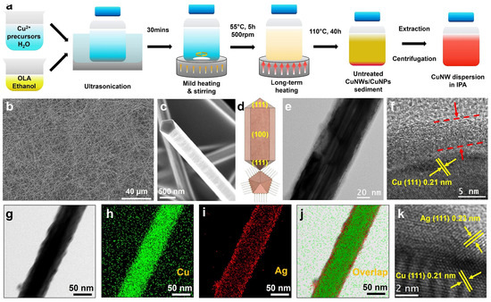 Fabrication of Cu@Ag core–shell NWs. (a) Schematic illustration of the synthesis of Cu NWs; (b,c) SEM images of Cu NWs; (d) schematic illustration of Cu NWs; (e) TEM and (f) HR-TEM of a Cu NW; (g) SEM image of a Cu@Ag NW and corresponding elemental distribution of (h) Cu, (i) Ag, and (j) both; (k) HR-TEM of a Cu@Ag NW [76].