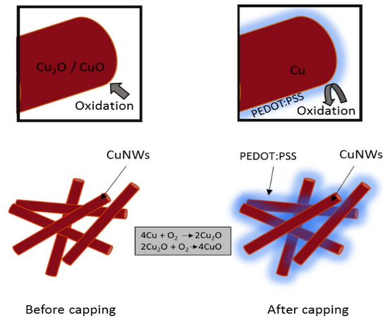 - Mardiansyah, D.; Badloe, T.; Triyana, K.; Mehmood, M.Q.; Raeis-Hosseini, N.; Lee, Y.; Sabarman, H.; Kim, K.; Rho, J. Effect of temperature on the oxidation of Cu nanowires and development of an easy to produce, oxidation-resistant transparent conducting electrode using a PEDOT:PSS coating. Sci. Rep. 2018, 8, 10639. [Google Scholar] [CrossRef]