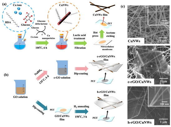 Fabrication of Cu NW–graphene FTCs. (a) Fabrication process of Cu NWs; (b) fabrication process of h-rGO/Cu NW films; (c) SEM images of Cu NWs, c-rGO/Cu NWs, and h-rGO/Cu NWs [83].