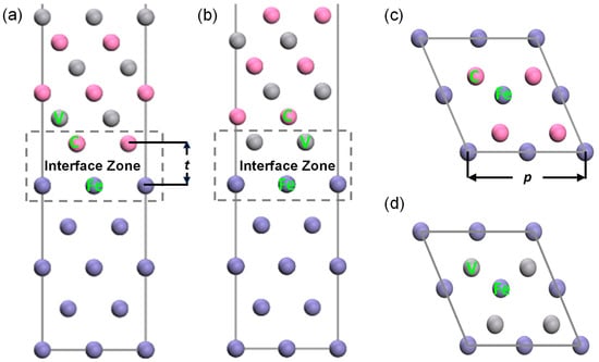 The front views of (a) α-Fe/VC–C, (b) α-Fe/VC–V, (c,d) and showing the top views at the interface zones of (a,b), respectively. The system is composed of 20 Fe, 12 V, and 12 C atoms, drawn in purple, grey, and pink, respectively. α-Fe/VN–N and α-Fe/VN–V were modeled in the same way.