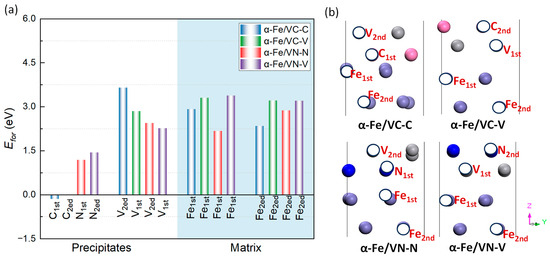 In addition to the above perfect interface, we also investigated the effect of a single vacancy on the interfaces. Considering the best trapping position of hydrogen in each perfect interface configuration, only Fe, C, N, and V vacancies within the two closest atomic layers located near the interface plane were explored here. To check the stability of vacancies more clearly, according to Equation (3), setting the chemical potential of C/N/V to , only the maximum formation energies of C, N, and V vacancies are plotted in Figure 2. Non-equivalent sites in the same atomic layer are also considered here to obtain the formation energy of the most stable vacancy. As shown in Figure 2, the formation energy of C vacancies near the interface between α-Fe and VC is significantly lower than that of V and Fe vacancies. Furthermore, the formation energy of C vacancies in the first layer is lower than that in the second layer. The lower the formation energy, the easier the vacancy is to form. The vacancy in the α-Fe/VN interface configuration also shows a similar pattern. The N vacancies in the first layer of the interface are the easiest to form, followed by the N vacancies in the sublayer. However, compared with the α-Fe/VC interface configuration, the formation energy of N vacancies is still much larger than that of C vacancies. The presence of vacancies also leads to a redistribution of electron positions. According to the charge density difference of different interfaces (Figures S6 and S7), the absence of Fe and V atoms leads to more electrons at the vacancy positions, whereas the absence of C and N atoms drives the local electrons to flock to the neighboring Fe or V atoms.