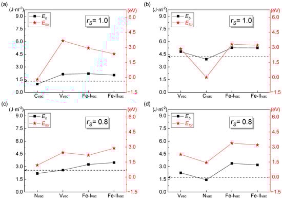 In general, when there are vacancies within the interface, the interface will be less stable. To further explore the effect of vacancy on the stability of each interface, we calculated the interfacial binding energy of each interface with different vacancies (Figure 3). Then, we calculated the correlation coefficient between Eb and Efor using Equation (4). The results show that the two are positively correlated: the harder it is to form vacancies, the more likely they are to lead to unstable interfaces. Compared to the perfect interface, the presence of Fe vacancies makes the interface more unstable. The opposite is true for C/N/V vacancies, whose presence reduces the interfacial energy. This may be related to the fact that the presence of C/N/V vacancies allows the bottom Fe atoms to be embedded into the nanoprecipitated phase.