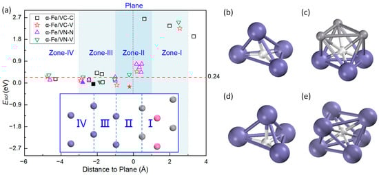 (a) Solution energy of H at different distances to the plane for different interfaces. Place the interface model horizontally. Zones I, II, III, and IV represent the interface-like VM, interface, interface-like Fe, and bulk-like Fe zone, respectively. The lowest solution energy of each interface indicates its best trapping site (the geometric structures are shown as (b–e), corresponding to the α-Fe/VC–C interface, α-Fe/VC–V interface, α-Fe/VN–N interface, and α-Fe/VN–V interface, respectively, where Fe is drawn in purple, V in grey, and H in white), which is indicated by a solid marker. The black dash-dotted line represents the interface plane, and the red dashed line represents the solution energy of H at TISs in bulk α-Fe. The negative abscissa region represents the side of the Fe block.