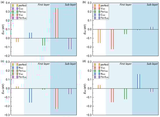 The solution energy for different vacancies at (a) α-Fe/VC–C, (b) α-Fe/VC–V, (c) α-Fe/VN–N, and (d) α-Fe/VN–V interfaces. The lowest solution energy on the perfect surface is also presented as the control data of other vacancies. The positions of the vacancies have also been marked. The light blue area represents the position of the first layer, and the blue area represents the position of the sub-layer.