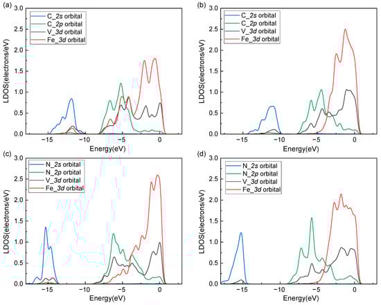 Based on the findings, we conclude that the ease of vacancy formation near the interface is strongly correlated with interface stability. A higher degree in the ease of vacancy formation leads to a greater energy release during interface formation, resulting in a less stable interface. By further investigating the reasons behind the ease of vacancy formation, we could identify the key factors influencing interface instability. By analyzing the local density of states (LDOS) of different atoms (Figure 6), we find that the higher formation energy of the V vacancy stems from the d-orbital hybridization of V and neighboring Fe atoms (3d orbitals of V and Fe), indicating that V atoms had stronger interactions with Fe atoms than C/N atoms.