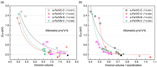 (a) The solution energies of the H atom at different Voronoi volumes; (b) the solution energies of the H atom at different ratios of Voronoi volume to coordination number. The lowest solution energy of each interface is indicated by a solid marker.