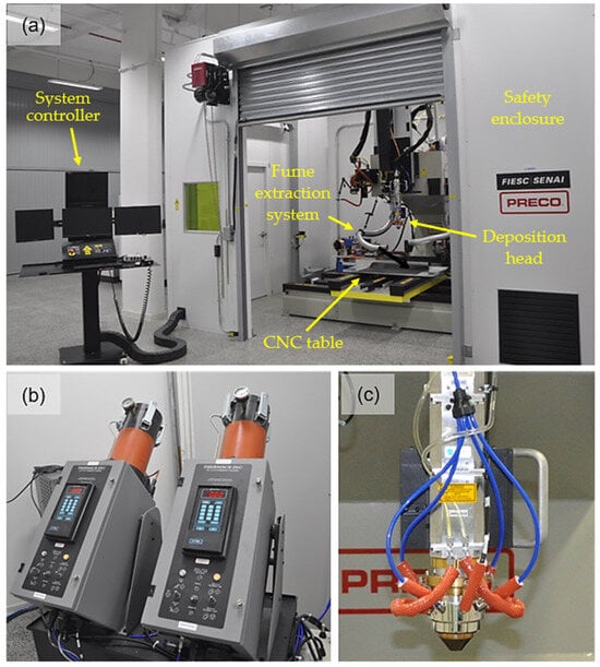 Laser cladding system used for producing the coatings: (a) general view of the equipment; (b) powder feeders (located at the back of the system); (c) deposition head.