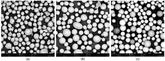 A group of AISI 304 substrates with dimensions of 76 (length) × 25.4 (width) × 15.9 (thickness) mm were coated with Inconel 625 and another one with Stellite 6, both with 10%, 20%, 30%, and 40% of WC content. For comparison purposes, coatings without any WC addition were also deposited. Gas-atomized metallic powders (Inconel 625 and Stellite 6) with a nominal particle size range of 50–150 µm were used for the matrices, while a gas-atomized ceramic powder (tungsten carbides—WC) with a nominal particle size range of 45–105 µm was used for the reinforcement. The general morphology of the powders used is shown in Figure 2, while their chemical compositions and that of the substrate are presented in Table 2, Table 3, Table 4 and Table 5. Prior to deposition, both the metallic and ceramic powders were stored in an oven to eliminate/prevent moisture, and the substrate was shot blasted to remove any surface contaminants and enhance laser beam energy absorption (by reducing reflection).
