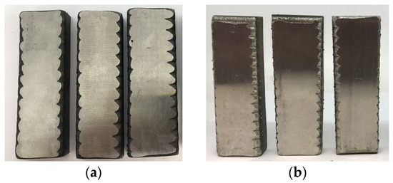 Typical samples of the coatings produced as prepared for the metal wheel test (nominal dimensions of 76 × 25.4 × 12.7 mm): (a) based on Inconel 625; (b) based on Stellite 6.