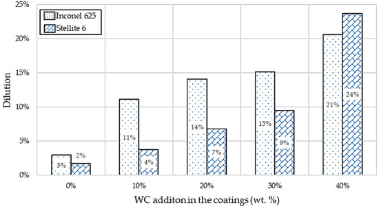 The addition of WC to the Ni-based and Co-based alloys accounted for an increase in the dilution of the coatings that were formed (Figure 6), which is likely a consequence of the high thermal conductivity of such a reinforcement, which in turn, affects the heat distribution during laser cladding. This characteristic prolongs the time during which the molten pool volume remains in liquid state, allowing for greater interaction/mixing between the coating and substrate, hence leading to higher dilution levels. Furthermore, the presence of partially melted WC particles in the molten pool modifies its viscosity, promoting disturbance and a more intense mixing of the molten material and consequently, favoring deeper penetration into the substrate. These effects have been, in fact, reported in the literature as key factors influencing the dilution levels in MMC coatings [27].