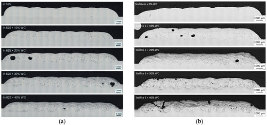 Typical cross-sections of the coatings with varying WC reinforcement additions: (a) Inconel 625 cases; (b) Stellite 6 cases.