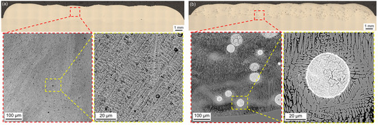 Typical microstructure of the coatings based on Stellite 6: (a) with 0% of WC; (b) with 20% of WC.