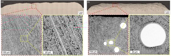 The macrographs of the cross-sections of the coatings based on Inconel 625 and Stellite 6 with the varying WC additions are compiled in Figure 7, where a relative homogeneity in the distribution of the carbides can be observed. Overall, the coatings exhibited a regular geometry but with an increasing trend in the size and frequency of internal defects as the WC content was raised.
