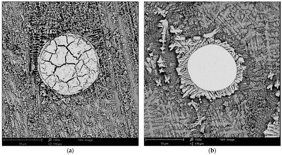 As expected, the coatings processed with the powder combinations containing WC particles exhibited a dispersion of partially melted carbides (Figure 8 and Figure 9) regardless of the matrix composition being based on Co or Ni. However, a critical difference referred to the cracking of WC particles, which occurred exclusively in the coatings based on Ni, i.e., formed in combination with Inconel 625 (Figure 10). This trend may be primarily attributed to thermal expansion coefficient differences between the Inconel 625 alloy and the WC particles. To assess this behavior, it is of relevance to follow step by step the phenomena occurring during deposition as WC particles are melted in the laser beam, subjected to subsequent solidification inside the molten pool, and then cooled within the deposits. The thermal history of such particles (consequence of the laser cladding parametrization) will determine if they are totally or partially melted during deposition depending on their melting temperature as well as on that of the matrix being used. The Inconel 625 alloy melts within the 1288–1349 °C range, whereas the WC particles melt at a much higher level (2870 °C). For coatings formed with such a combination of materials, after deposition, solidification starts with the formation of Ni-based dendrites at the fusion line and advances very rapidly due to the fast-cooling rates imposed by the high-density energy of the laser beam that induces a sharp temperature gradient between the molten pool and the substate. Also, the partially melted carbides in the molten pool play a small role as nuclei for solidification, although this factor is more significant in coatings based on Co alloys, as is the case with the Stellite 6 matrix (Figure 9b). The fast solidification of the Ni alloy together with the aforementioned difference in thermal expansion coefficients likely generate high residual stresses at the reinforcement–matrix interface, leading to crack formation across the WC particles. As a matter of fact, this behavior aligns with a previous investigation that examined stress evolution in laser-cladded coatings reinforced with WC [8]. Opposite to the results found for the Ni alloy matrix (Inconel 625), the coatings based on the Co alloy matrix (Stellite 6) better accommodated the WC particles. In relation to that, it has been reported that the solubility of WC in Ni is higher than in Co [29], and this behavior may explain the more significant solidification surrounding the carbides in the coatings based on Stellite 6. Also, the infiltration of Co into the WC particles results in WC-Co formation, an arrangement that preserves both the hardness and strength of the carbides.