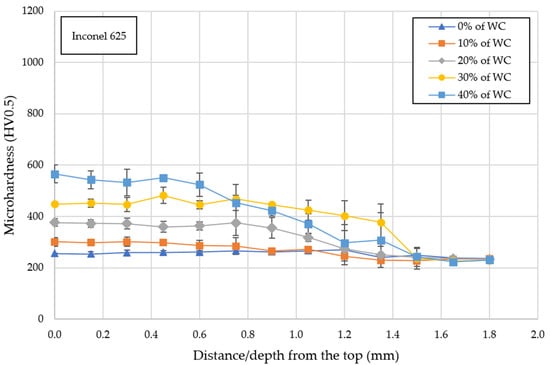 The hardness profiles of the coatings based on Inconel 625 and Stellite 6 with the different WC contents are presented, respectively, in Figure 11 and Figure 12, while the average hardness values on their top surfaces are shown in Figure 13. As expected, for both the alloys, the increase in the addition of WC resulted in higher hardness levels. The nearly flat hardness profiles confirm the homogeneous distribution of WC particles throughout the thickness (depth) of the coatings. The hardness levels of the cases based on Stellite 6 were higher due to the presence of carbides inherent to the composition of such a material.