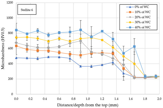 Effect of the addition of WC particles on the hardness profiles of the coatings based on Stellite 6.