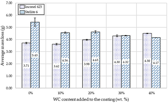 Figure 14 presents the effect of WC addition on the abrasive wear resistance (measured in terms of mass loss) of the coatings based on Inconel 625 and Stellite 6. Contrary to expectations, the coatings made of Inconel 625 only (without WC) exhibited a mass loss significantly lower than the Stellite 6 case, i.e., resulted in a better abrasive wear resistance. Focusing on the coatings based on Stellite 6, the higher the WC addition, the lower the mass loss (the greater the wear resistance). This effect appears to be more significant for small additions of WC (up to 10%, beyond which further increases in the WC content did not significantly enhance the performance). On the other hand, the wear resistance decreased with the addition of WC particles for the coatings based on Inconel 625.