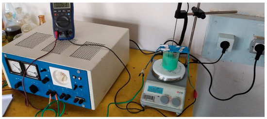 A 200 mL Pyrex glass beaker was used as the container for the electrolyte solution, which was continuously stirred by a magnetic stirrer bar (6 mm diameter × 30 mm length) at a speed of 600 rpm for 16 h to ensure homogeneity. Before electrodeposition, the solution was subjected to ultrasonic agitation for one hour to eliminate any remaining undissolved particles. The electrodeposition process was conducted using a hot plate stirrer (D_LAB, MS-Pro+) coupled with a thermometer to maintain the required temperature and agitation rate.