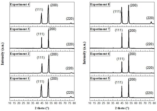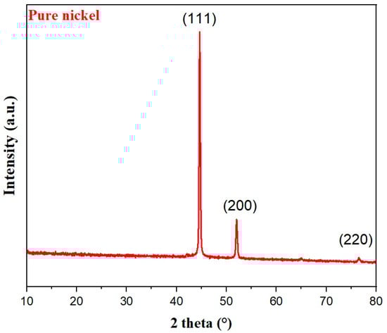 Figure 2 presents the XRD patterns of pure nickel. The diffraction peaks at 2θ positions corresponding to 44.64°, 52.04°, and 76.51° are indexed to the (111), (200), and (220) planes, respectively, indicating a face-centered cubic (FCC) crystalline structure. The intense peak at (111) suggests a preferential growth orientation. This single phase with an FCC structure was consistent with the results of [22,23,24,25].