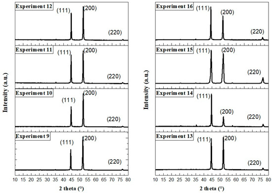 XRD pattern of the 16 fabricated Ni-Al2O3 composite coatings, identified according to the design of the experiment plan presented in Table 3.