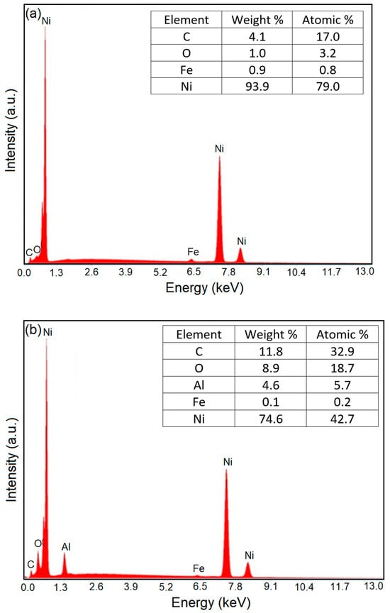 This view is further supported by energy-dispersive spectroscopy (EDS) analysis. Figure 5 confirms the successful incorporation of Al2O3 particles into the Ni matrix during electrodeposition, as indicated by the intense peaks of Al and O in the spectrum of the Ni-Al2O3 composite (Figure 5b). In contrast, Figure 5a shows that the pure Ni coating is predominantly composed of nickel with a low presence of oxygen, which aligns with the XRD analysis. The inset presents the weight and atomic percentages of the elemental composition of the coatings.