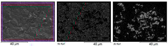 Figure 6 displays SEM/EDS mapping, illustrating the elemental distribution of Ni and Al on the surface of the Ni-Al2O3 composite coating. The Al (Ka1) mapping highlights concentrated clusters of alumina particles, while the Ni (Ka1) mapping reveals a more continuous distribution, suggesting that nickel forms the predominant metallic matrix. These clusters exhibit a significantly stronger Al signal due to the agglomeration of alumina nanoparticles. This implies that freshly entrapped alumina nanoparticles were incorporated during electrodeposition, likely due to their high surface activity [32,33,34], with Ni preferentially depositing around them. Similar findings were reported in [35], where it was concluded that the presence of Al2O3 nanoparticles obstructs the movement of dislocations in the nickel matrix, yielding an increase in grain size [32], which, in turn, enhances hardness and corrosion resistance [36].