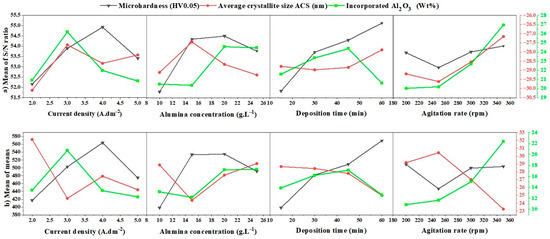 For the average crystallite size (Table 8), the analysis elucidates that agitation rate is the most influential factor across both signal-to-noise ratios and mean values, contributing 32.81% to the overall variability, followed by current density with 32.07%. Alumina concentration and deposition time contribute 18.97% and 7.01%, respectively, indicating their lower impact. The ranking of effects for the mean response similarly places current density first, followed closely by agitation rate, alumina concentration, and deposition time. This ranking confirms and supports the previous research [35,41,43]. The significance of current density at a certain level highlights its relevance. Agitation rate, though slightly less dominant, also plays a central role.
