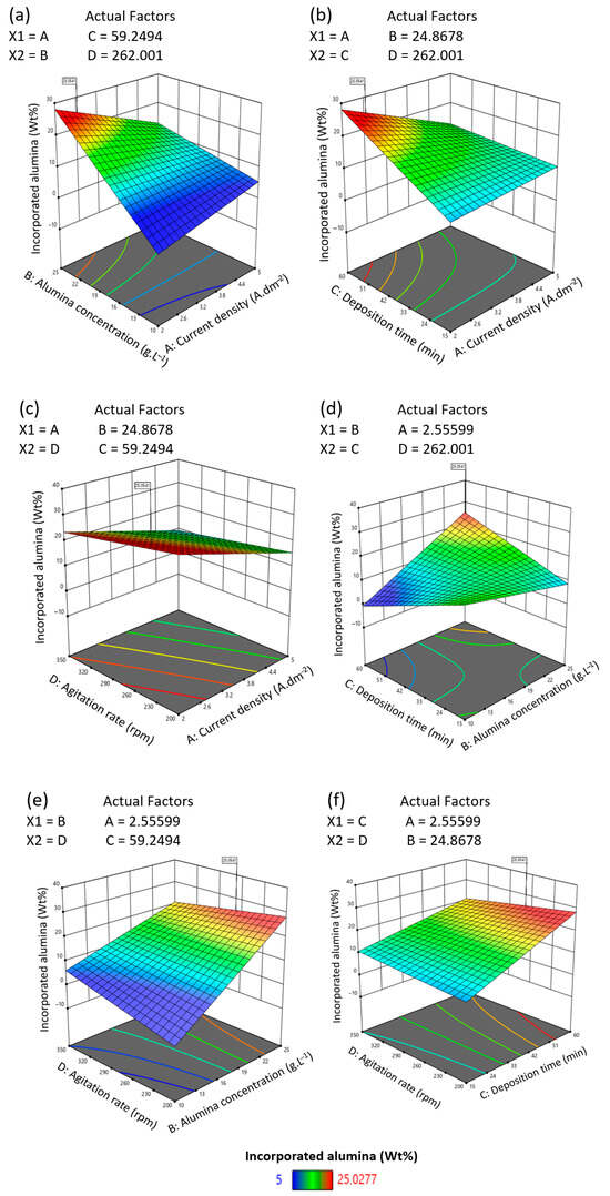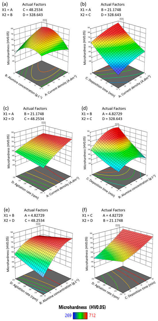 The fabrication of Ni-Al2O3 electrodeposited composite coatings was optimized through 3D surface analysis using Design-Expert13 software. This approach enabled a comprehensive evaluation of the interactions between key input variables and their effects on the coating’s properties. The 3D surface plots in Figure 8, Figure 9 and Figure 10 visually represent the responses in relation to the microhardness, average crystallite size, and incorporated alumina with the combined influence of parameter interactions (AB, AC, AD, BC, BD, and CD). The 3D surface allows two variables to be analyzed simultaneously while the other two variables remain in the optimum response target. Strong agreement between experimental and anticipated values demonstrates the excellent predictive accuracy of the Design-Expert models, underscoring the efficiency of this optimization technique in fine-tuning process parameters for optimal material properties.