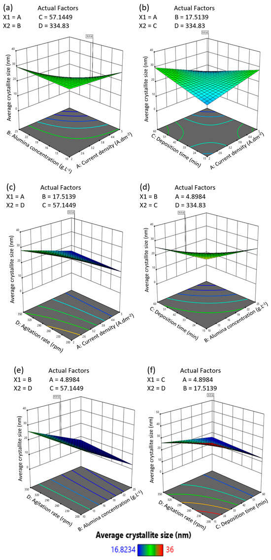 Three-dimensional plots depicting the impact of input parameters and their interactions on the average crystallite size of the composite coating.