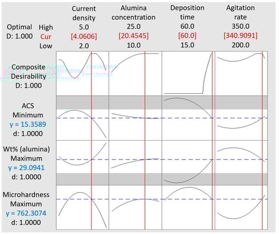 Figure 12 highlights the optimal response values achieved: a microhardness of 762, an average crystallite size of 15.36 nm, and 29.09% Al2O3 incorporation. These results were obtained using an applied current density of 4.0606 A/dm2, an alumina concentration of 20.4545 g/L, a deposition time of 60 min, and an agitation rate of 340.9091 rpm, culminating in a composite desirability value of 1.
