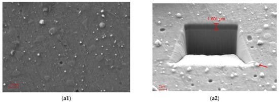 Figure 2 and Figure 3 present the scanning electron microscopy (SEM) morphology of the uncoated Cr12MoV specimen and the AlCrN coated specimens, respectively. From the microstructure morphology of Cr12MoV in Figure 2, there were some white, massive eutectic carbides unevenly distributed within the tempered martensite matrix, and some granular secondary carbides were also found. The surface of the AlCrN coating on the specimen exhibited a relatively uniform and flat appearance, with no significant defects such as large pinholes, bubbles, or spalling. However, some small deposition particles of varying sizes were noted, along with a limited number of near-circular pits that were randomly and unevenly distributed across the coating surface, as characterized in Figure 3(a1,a2). These defect features (particle deposits and pits) can be primarily attributed to the principles underlying the multiarc ion plating process. Under arc current conditions, localized overheating of the target material occurs, resulting in a molten pool formation on its surface. Subsequently, melt droplets from this target are deposited onto the substrate during sputtering processes, leading to granular deposition. Additionally, collisions among atoms or ions during sputtering may result in aggregation into larger particles before reaching the coating surface; this phenomenon is typically correlated with arc current magnitude [22,23]. As bias voltage increases, droplet size decreases, and the microstructure becomes more uniform [18]. The formation of near-circular pits is attributed to antisputtering effects on the coating surface caused by ion bombardment during physical vapor deposition (PVD).