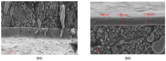 The morphology of a cross-sectioned coating is illustrated in Figure 3(b1,b2), where optical microscopy was employed to measure coating thickness. As shown in Figure 3(b2), the AlCrN coating was dense and uniform, with approximately uniform thickness. The interface between the coating and substrate was flat while exhibiting dense columnar structures along the thickness direction. Grain growth appeared directed upward and outward as well along the energetically favorable orientation, which led to a strong crystal texture of the material during physical deposition [22].
