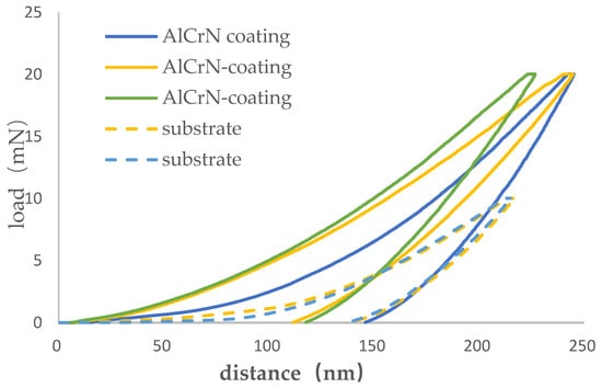 According to the model and computational method above, the average nanohardness of the single-layer AlCrN coating was found to be 23.8 ± 3.1 GPa, which was consistent with the reported nanohardness values for AlCrN-based coatings in the literature [21] (approximately 22 GPa) but differed from the value of 36 ± 1.2 GPa in the literature [26] because of different Al/Cr composition. In contrast, the average nanohardness of the Cr12MoV substrate was measured at 11.97 GPa.