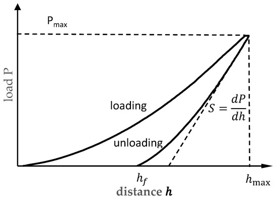 where is the maximum load; is a constant that depends on the geometry of the indenter, about 0.72 (for a conical punch), 0.75 (for a paraboloid of revolution), and 1.00 (for a flat punch); the contact stiffness, , is defined as the slope of the upper portion of the unloading curve during the initial stages of unloading; and the contact depth that the indented with the tested material, , is