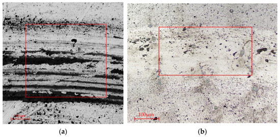 SEM morphology of wear tracks of samples. (a) Cr12MoV substrate without coating; (b) with AlCrN coating (The morphology of the wear tracks is presented within the red rectangular box).