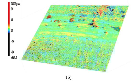 Observing the wear track morphologies depicted in Figure 7, the surface of the uncoated Cr12MoV substrate exhibited pronounced gully wear marks caused by friction, with wider and deeper dimensions (Figure 7a). In contrast, the wear marks on the coated AlCrN sample were less prominent and exhibited narrower wear traces (Figure 7b). As shown in the 3D surface profiles of the samples after the wear test in Figure 8, it is evident that the surface of the coated sample remained relatively flat, with an average surface roughness of 0.26 μm. Conversely, the average surface roughness of the uncoated Cr12MoV substrate was measured at 0.81 μm.